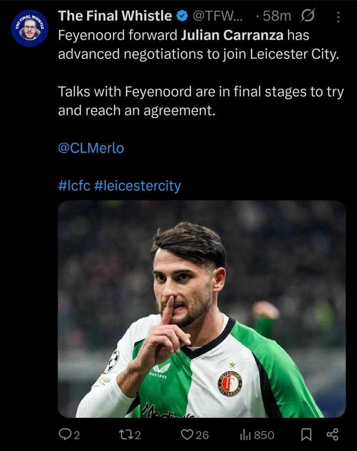 Leicester City are in ‘advanced negotiations’ to sign Feyenoord forward Julian Carranza, with discussions regarding the transfer ‘in the final stage’.