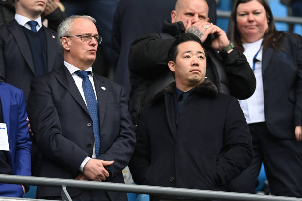 MANCHESTER, ENGLAND – APRIL 15: Leicester City director of football Jon Rudkin stands with chairman of Leicester City Aiyawatt Srivaddhanaprabha during the Premier League match between Manchester City and Leicester City at Etihad Stadium on April 15, 2023 in Manchester, England. (Photo by Michael Regan/Getty Images)