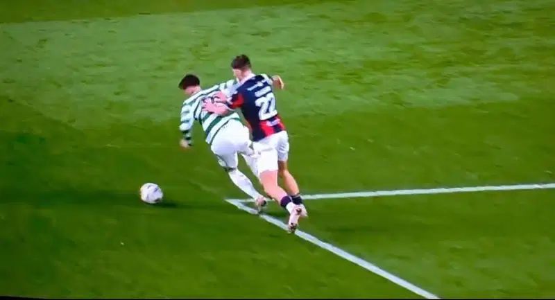 With the Scottish Cup clash still scoreless, the imposing forward became entangled in a physical battle with visiting defender Luke Graham near the edge of the area. As the Celtic attacker carried the ball into the box, he went down under pressure.